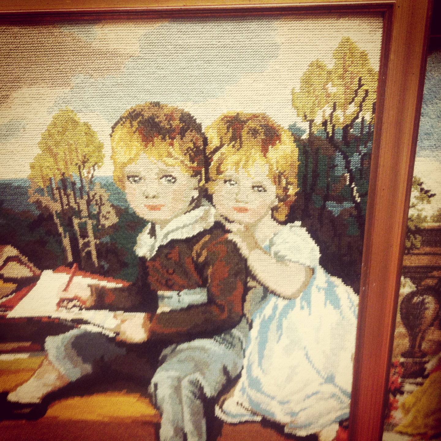 Au rayon des cadres, il y avait beaucoup de canevas très très laids et on n’en a pas achetés. Pas même celui-ci qui, pourtant, m’a rappelé mon enfance étant donné qu’on avait le même sur un mur du salon (maman dirait « Oui mais c’était la mode à l’époque !« ) (genre).