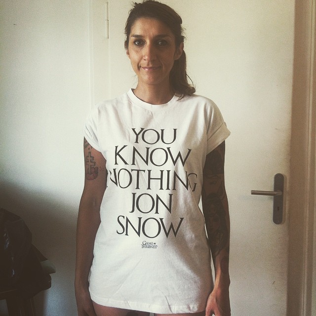 – J’ai deux nouveaux t-shirts préférés (oui, encore) qui détrônent mon t-shirt Jon Snow, l’un avec Max Rockatansky et son chien, l’autre avec Conan et Valeria. J’arrive pas à déterminer lequel est le plus cool des deux et je garde jalousement l’adresse de la boutique où je les ai trouvés. Du coup, je les mets tout le temps, avec des sneakers pour aller promener le chien, avec des escarpins pour sortir le samedi soir, et même avec un slip en coton pour dormir. Et de temps en temps, je les enlève pour les laver, tout de même. Mais pas d’inquiétude, ça passera au prochain t-shirt préféré.
