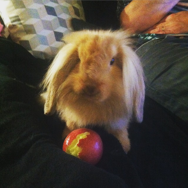Gilbert, le lapin chattophile aux cheveux longs, mangeant une pomme devant Super Vixens avant sa prochaine tentative de viol